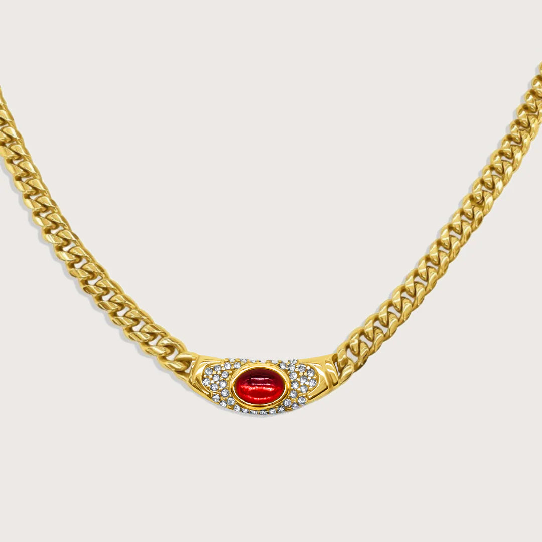 Designed to sit close to the heart, this piece reflects the kind of beauty that doesn’t chase attention, it commands it. The bold red center symbolizes passion and vitality, while the gold setting represents luxury, power, and self-worth.